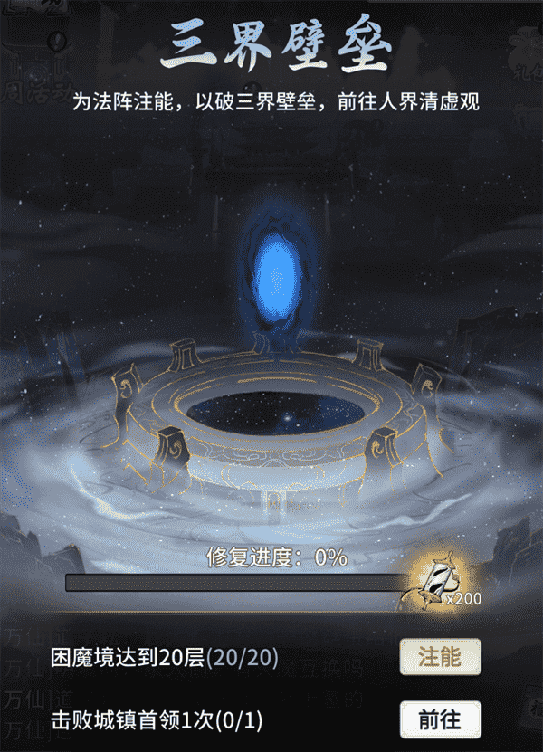 当你修为达到返虚/破虚中期后,,,,可在城镇寻得芸丫并激活神秘法阵,,,,通过收集材料、、、、击败首领等方式为法阵注能,,借以打破三界壁垒,,,,开启支线剧情“清虚旧梦”