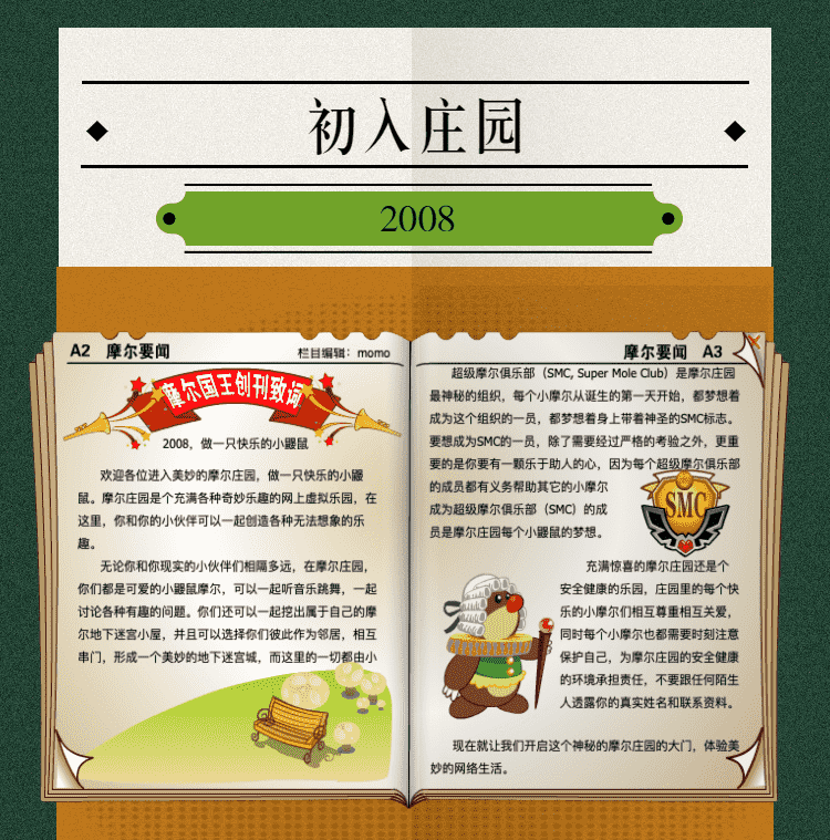 在这一年,,摩尔庄园诞生了。。在这里,,大家都是可爱的红鼻子鼹鼠小摩尔,,,,可以一起勤劳耕作,,,一起高山滑雪......我们都是摩尔庄园的建设者。。