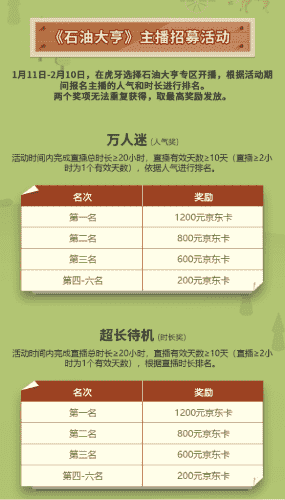 除了“油王”争霸赛,,,,精英主播招募活动亦同步开启!!赛事分时长奖和人气奖,,,奖励同样丰厚!!