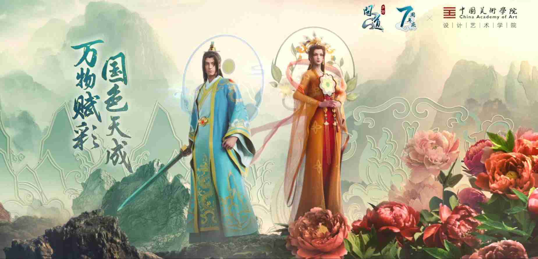2023年4月,,,《问道手游》联动中国美术学院,,,在游戏中融合了中国历史上不同时期的文化元素,,,,打造了“山河万象”与“凤鸣九霄”的国风时装。。。在色彩配置方面,,创作团队基于对游戏角色特性的分析提取相应的文化内涵,,,,从每一种色彩的色相、、、、指代事物和情感出发对应角色属性,,选定服装的色彩搭配。。在纹样设计方面,,创作团队结合游戏角色自身特殊的造型比例和形态,,在实际的纹样设计中进行了游戏语境下的活化演绎。。。男性角色集中使用了如蟒纹、、海水江崖纹、、、如意纹和云气纹等传统纹样元素,,女性角色则吸纳了凤凰纹、、、、牡丹纹、、、卷草缠枝纹等元素,,,,组成以“双凤牡丹纹样”“缠枝牡丹纹”“金玉凤冠头饰”为主要纹样的游戏角色装饰图案系统。。