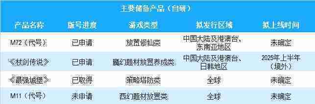 公司有多款储备产品,,,涵盖放置类、、、、策略类、、RPG、、、、Roguelike等多元化游戏品类,,,储备的主要自研和代理产品如下::